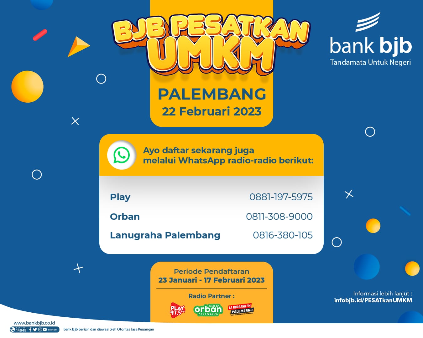 Talkshow bjb PESATkan UMKM di Palembang akan diselenggarakan pada Rabu, 22 Februari 2023 di Kota Palembang. Informasi selengkapnya dapat diakses di laman web infobjb.id/PESATkanUMKM.